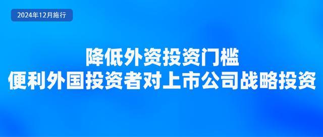 11月1日,商务部、中国证监会、国务院国资委、税务总局、市场监管总局、国家外汇局修订发布《外国投资者对上市公司战略投资管理办法》,自2024年12月2日起施行。修订后的《办法》主要是从五方面降低了投资门槛。一是允许外国自然人实施战略投资。二是放宽外国投资者的资产要求。三是增加要约收购这一战略投资方式。四是以定向发行、要约收购方式实施战略投资的,允许以境外非上市公司股份作为支付对价。五是适当降低持股比例和持股锁定期要求。