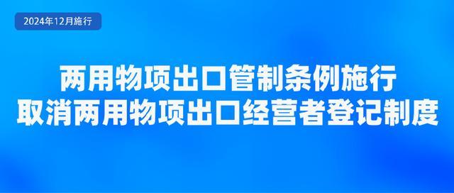 《中华人民共和国两用物项出口管制条例》自2024年12月1日起施行。《条例》共6章50条。《条例》取消两用物项出口经营者登记制度,增强两用物项出口管制政策的透明度和规范性,明确拟定出口管制政策的考量因素和程序规定。细化两用物项出口管制许可便利措施及其适用条件、程序等。明确制定、调整管制清单和实施临时管制的程序和要求,对两用物项出口实施许可,并对申请许可的条件、程序等作出规定。严格两用物项最终用户和最终用途管理,细化管控名单制度,建立关注名单制度,完善全链条管控措施。