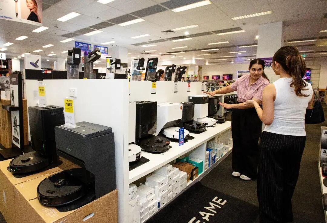 在澳大利亚悉尼市中心一家电器商场内,店员向顾客介绍石头科技的扫地机器人。新华社记者 马平摄