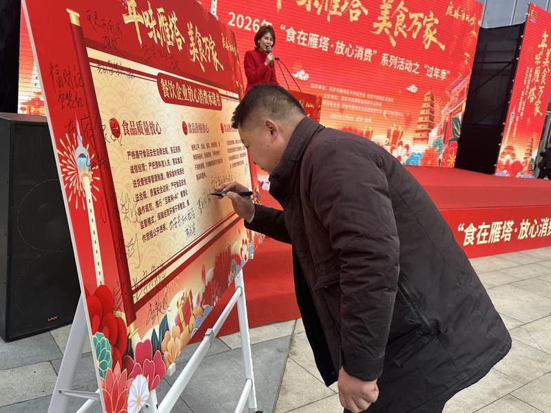为了让市民吃得放心,买得安心,此次活动筹备阶段便坚守“源头管控、从严筛选”原则,组建专项工作组对所有入场企业开展全方位资质核查,逐一核验营业执照、食品经营许可证、供货商资质等关键材料,筑牢安全防线;启动仪式现场,餐饮企业代表集体签订《放心消费承诺书》,以公开承诺的方式压实企业主体责任,为消费者权益保驾护航;热闹的摊位旁边,雁塔区市场监管局派出食品安全快检车驻守,对参展商户的食材、成品进行随机抽样、即时检测,让消费者看得明白、吃得放心。