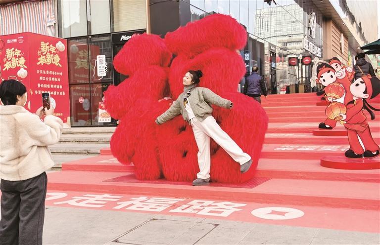 随着春节临近,西安市朱雀大街一商场门前竖起巨型“福”字,造型醒目、喜庆大气,吸引不少过往市民驻足拍照打卡。